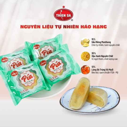 Nếu chưa, hãy thử ngay bánh Pía Trứng Đậu Xanh Sầu Riêng Monthong tươi từ Thiên Sa, với vỏ bánh ngàn lớp đặc trưng và vị ngọt thanh, béo bùi nguyên bản của những chiếc Pía ngày xưa.