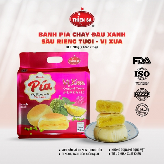 Là một trong những dòng bánh best seller bán chạy nhất của Thiên Sa, Bánh Pía Chay Đậu Xanh Sầu Riêng đã chính thức xuất khẩu vào các thị trường quốc tế như: Mỹ, Canada, Pháp, Nhật, Nga, Hàn Quốc, Úc, Trung Quốc, Đài Loan, Malaysia, Lào, Campuchia… Đạt 4 tiêu chí xuất khẩu: FDA - ISO - HACCP - HALAL đảm bảo ATVSTP.