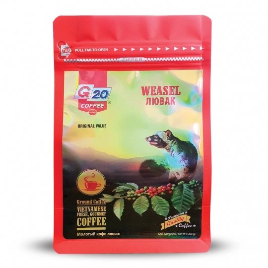 Cà phê phin chồn vàng G20 Coffee được sản xuất tại Việt Nam trên dây chuyền công nghệ hiện đại, đảm bảo an toàn cho sức khỏe. Kết hợp cùng công thức chế biến riêng biệt, cho ra sản phẩm đạt chất lượng cao.