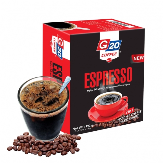 Cà phê đen 2in1 - Espresso với công nghệ rang và tạo ra tinh thể đậm đặc hòa tan, nguyên chất, Cà phê hòa tan đen đá 2in1 G20 mang đến tay người tiêu dùng sản phẩm cà phê hòa tan đen đá thuần túy 100% với hương vị mạnh, đúng “gu” uống cà phê đen của người Việt. Sản phẩm giữ được vị đắng thật của cà phê rang xay đem đến cho người thưởng thức một ly cà phê đen thứ thiệt.